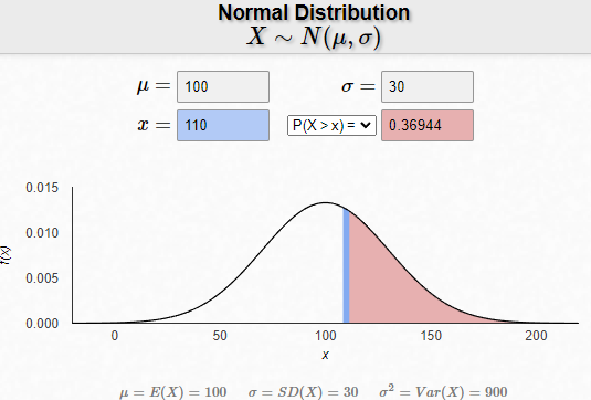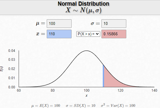 Now let’s assume a normal distribution of prices for that stock (we should technically use a lognormal but this calculator was prettier so go with it) and the stock also has a standard deviation of $10 (that’s a rough measure of the distance from the current price we can expect the price to trend towards in a large of number of repeated trials). This means we have a 16% chance that during some period the stock price will end up above $110.